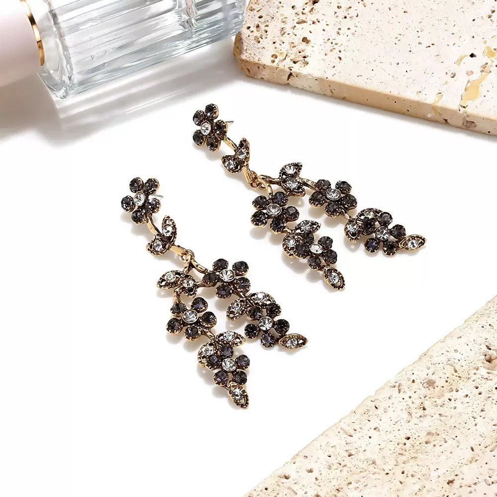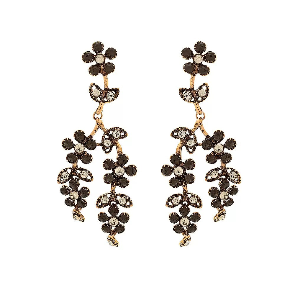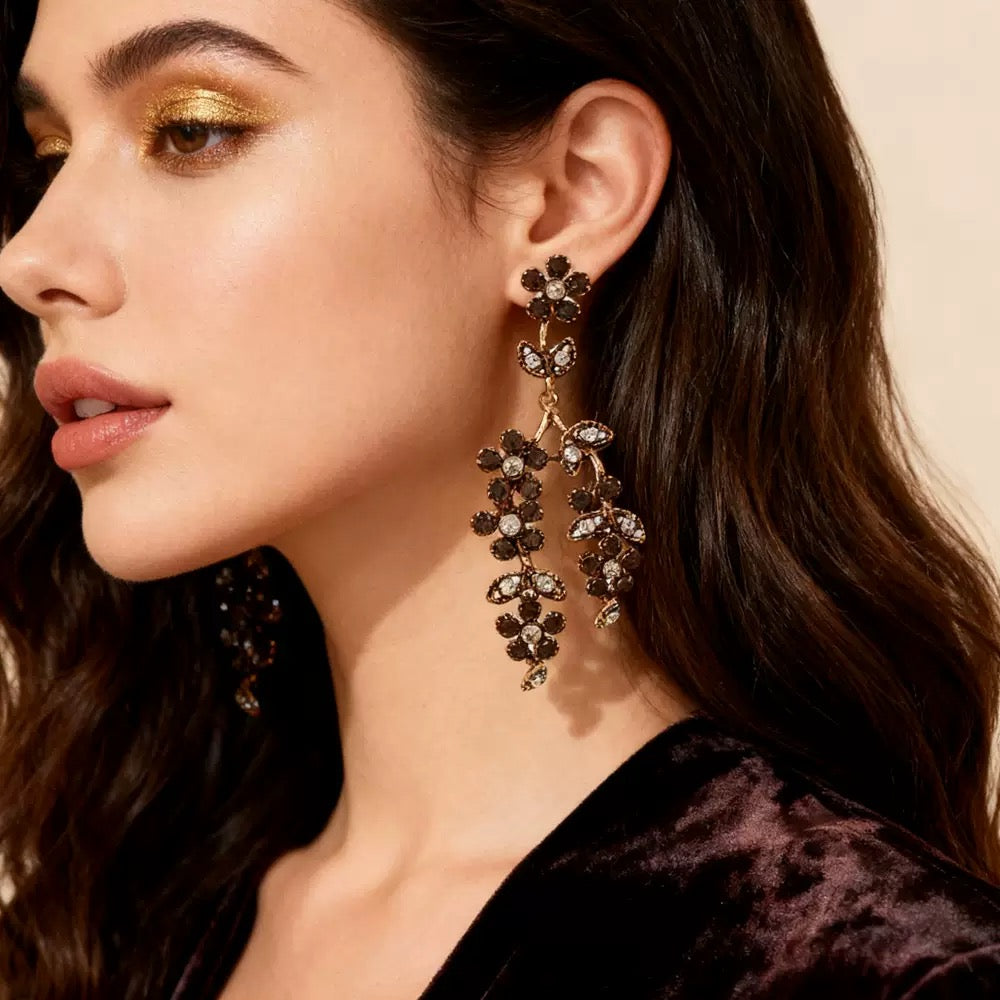 A moody masterpiece for the bold romantic. These shoulder-grazing drops draw inspiration from vintage baroque jewelry, featuring cascading floral vines encrusted with subtle, glimmering crystals. Finished in a rich antique-gold tone, they bring an air of old-world drama to your velvet dresses and evening silhouettes.