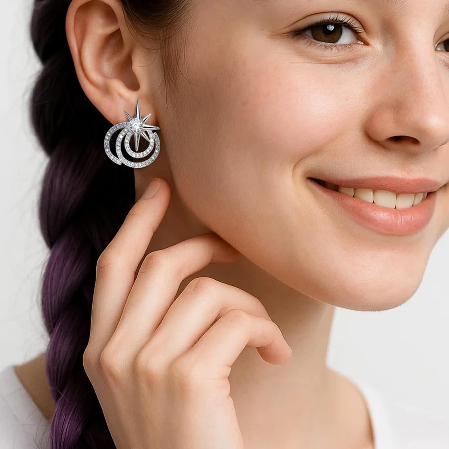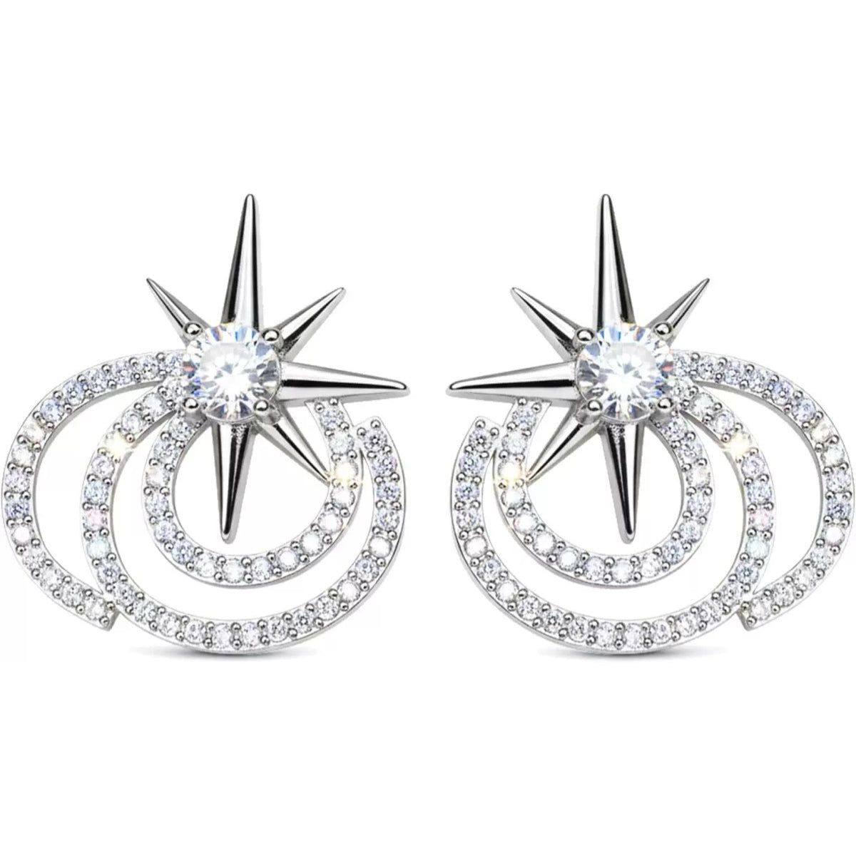Channel a touch of celestial magic. Inspired by the trending Glinda aesthetic, these intricate huggies feature a suspended star motif nestled within concentric halos. The micro-pave stones capture the light with every movement, bringing a subtle, enchanting sparkle to your everyday uniform.